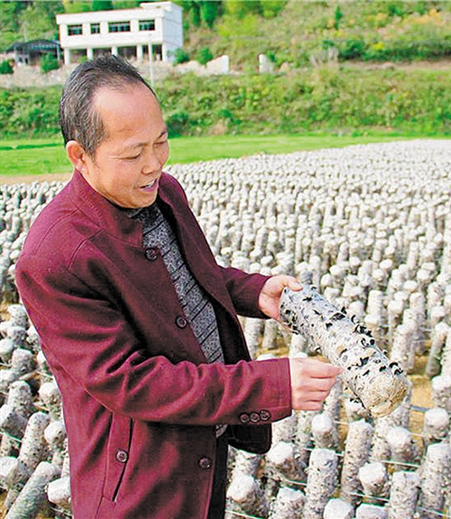 中华山村村委会主任毛照新查看菌棒长势情况。经济日报-中国经济网记者 王新伟摄