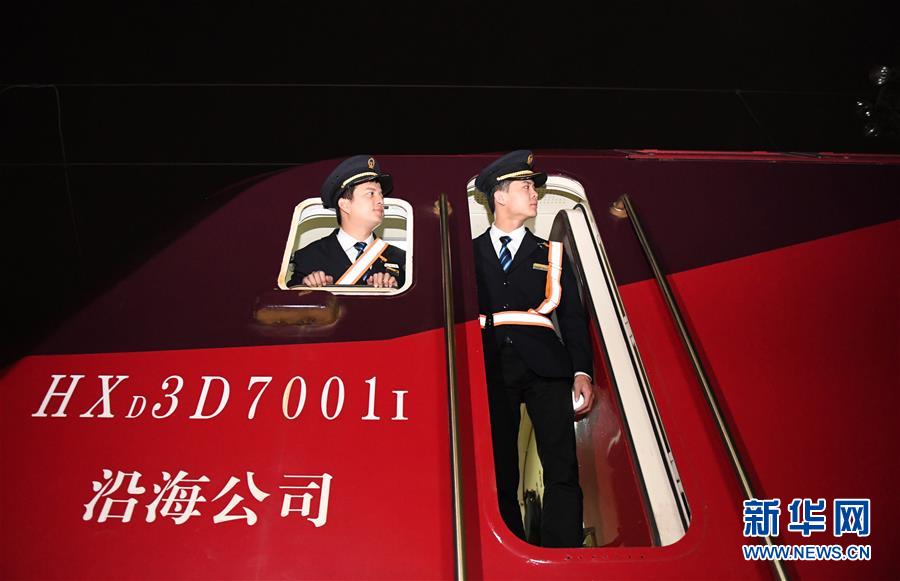 2月21日3时许,周广杰(左)和副司机廖科杰站在准备开行的“排雷车”上向外望。 新华社记者陆波岸摄
