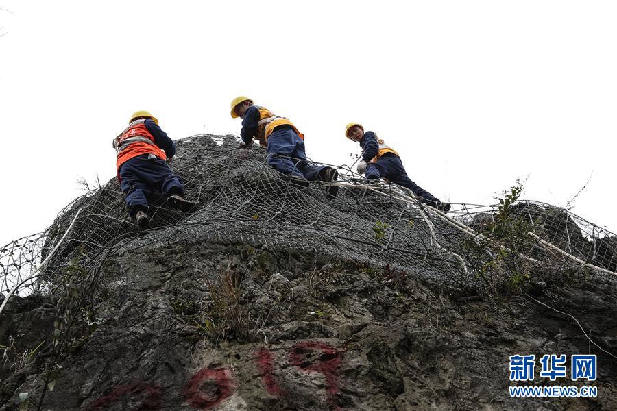 2月21日,贵阳高铁工务段工作人员在沪昆高铁一处隧道上方处理危石。新华社记者 刘续 摄