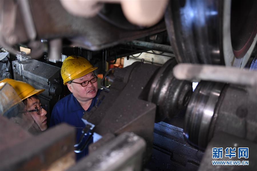 2月21日,机车镟轮工张杰(右)和工友朱永强在西安机务段检修车间讨论机车轮对镟修工作方案。新华社记者李一博摄