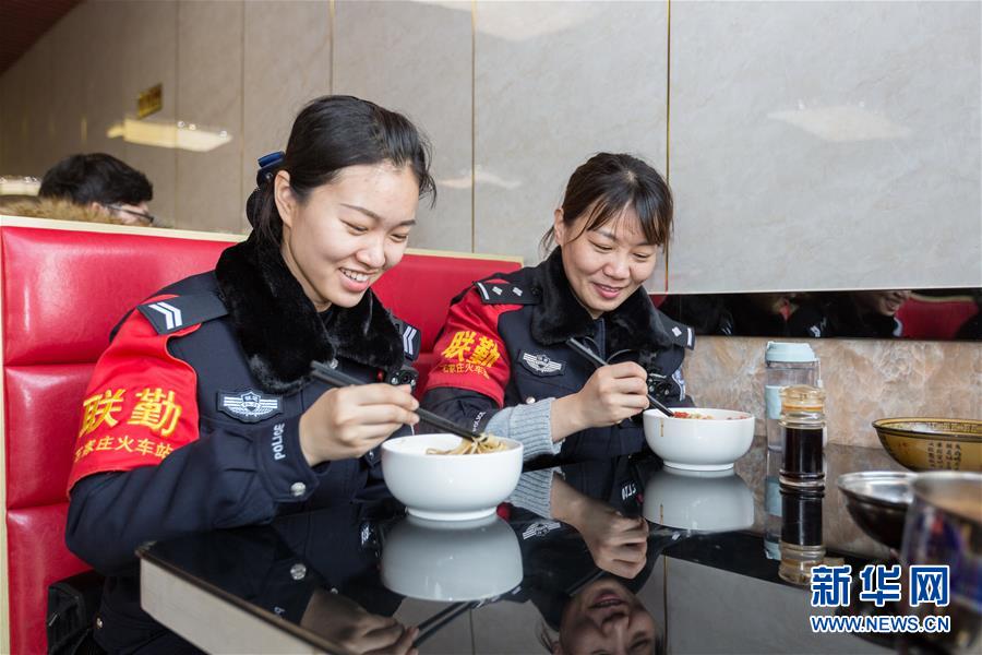 2月23日,午休时间,师父张姿(右)和王蕾一起吃午饭。 新华社记者牟宇摄