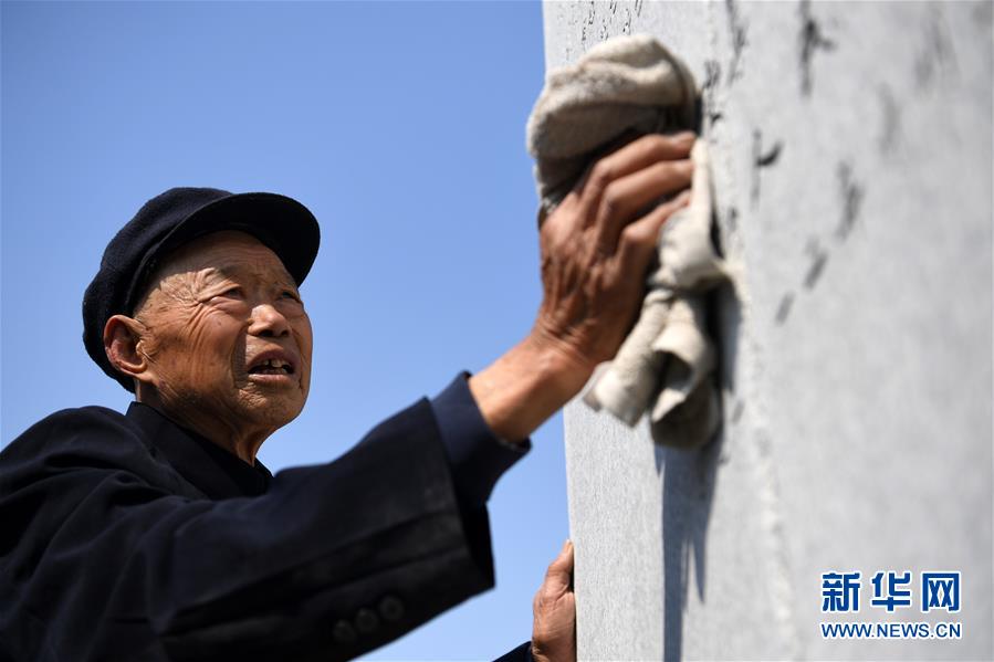胡兆伦在烈士陵园里清洁墓碑(3月14日摄)。 新华社记者刘军喜摄