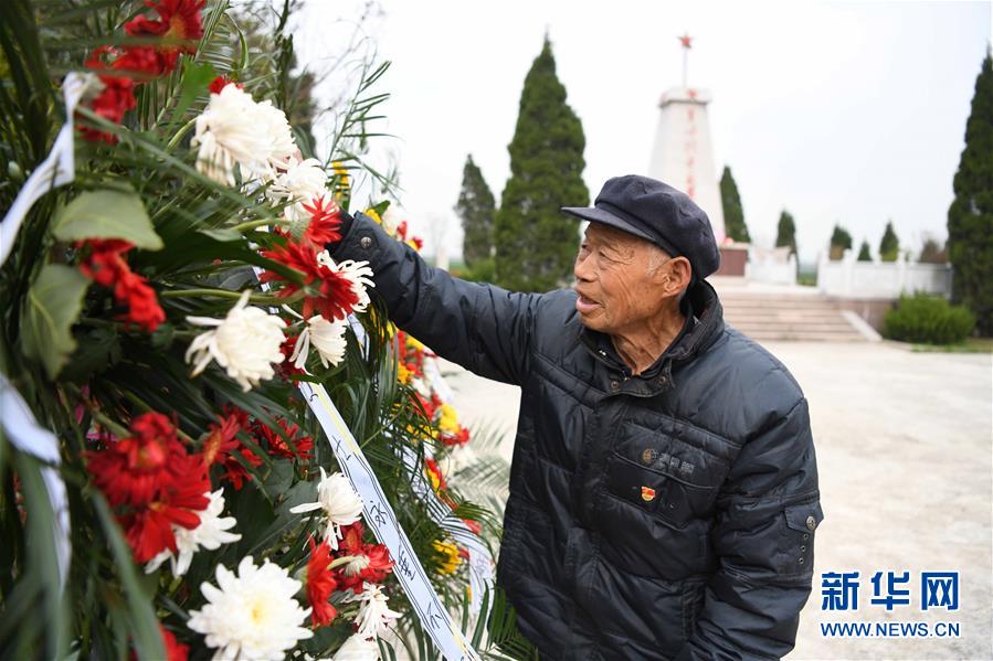 4月2日,胡兆伦在烈士陵园里整理花圈。 新华社记者刘军喜摄