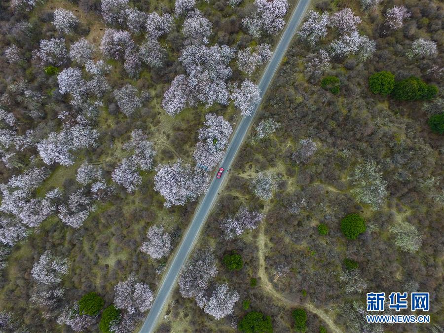 这是经过林芝波密境内桃花丛的公路(2016年4月1日无人机拍摄)。 新华社记者 普布扎西 摄