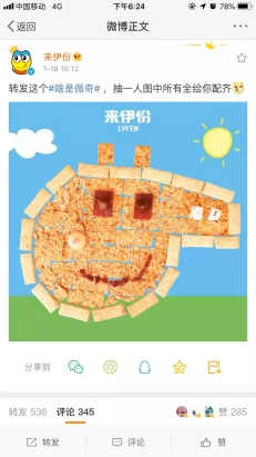 而临时性热点最讲究速度,在第一时间抓住消费者的眼球。在《啥是佩奇》的佩奇热中,来伊份迅速以产品拼接出零食版“小猪佩奇”,并且换道超车在微博上与粉丝亲密互动,“抽一位粉丝,图中所有零食给你一站式配齐”,玩起了“配齐”对应“佩奇”的梗,可谓是出其不意。而在iPhone手机推出双卡双待时,来伊份则皮了一下,巧妙地秀起了天天坚果“双卡双袋”的梗,收割一大波粉丝流量。