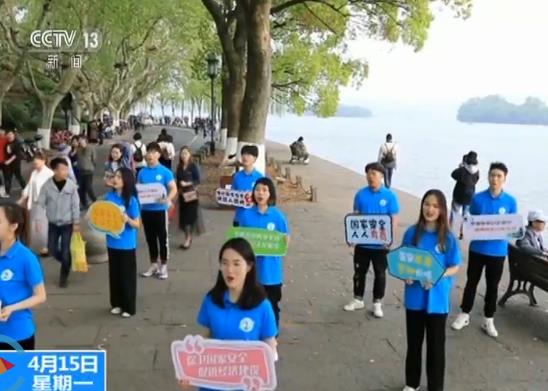 西湖边,“我和我的祖国”的歌曲旋律吸引了来往市民的驻足聆听,这是一群青年学生正通过“快闪”的形式,展示国家安全教育标语板,让国家安全教育走上街头。
