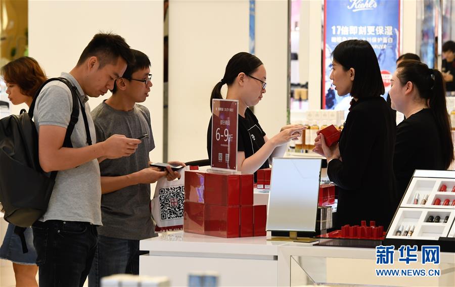在海口市免税店,顾客挑选商品(4月9日摄)。新华社记者 杨冠宇 摄