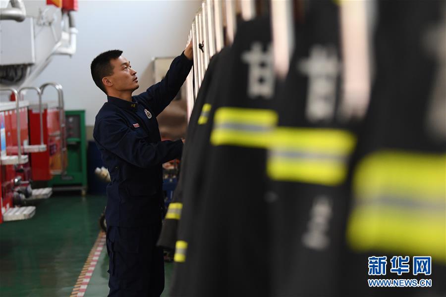 李志亮在整理消防救援服(4月11日摄)。新华社记者 陈斌 摄