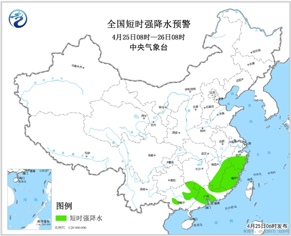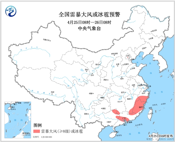 预计4月25日08时至26日08时,广西东北部、广东中西部、湖南南部、江西东部、福建大部和浙江南部等地局地将有8-10级雷暴大风或冰雹天气;此外,广西中部和东北部、广东中部和东北部、湖南南部、江西东部、福建大部和浙江南部等地的部分地区将有短时强降水天气,小时降水量20-50毫米,局地可达60毫米以上。