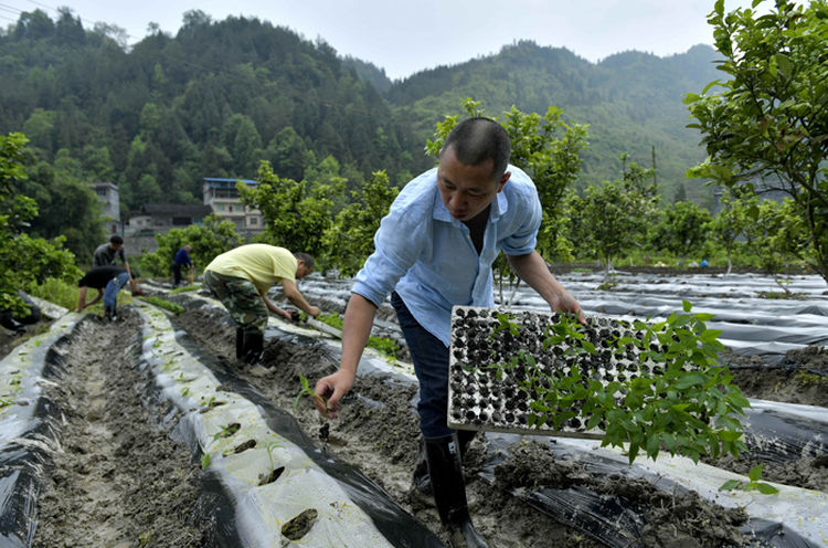 湖北宣恩县直机关干部与村民一起移栽辣椒苗