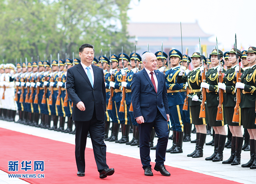 4月29日,国家主席习近平在北京人民大会堂同瑞士联邦主席毛雷尔举行会谈。这是会谈前,习近平在人民大会堂东门外广场为毛雷尔举行欢迎仪式。 新华社记者 刘卫兵 摄