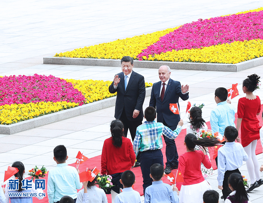 4月29日,国家主席习近平在北京人民大会堂同瑞士联邦主席毛雷尔举行会谈。这是会谈前,习近平在人民大会堂东门外广场为毛雷尔举行欢迎仪式。 新华社记者 谢环驰 摄