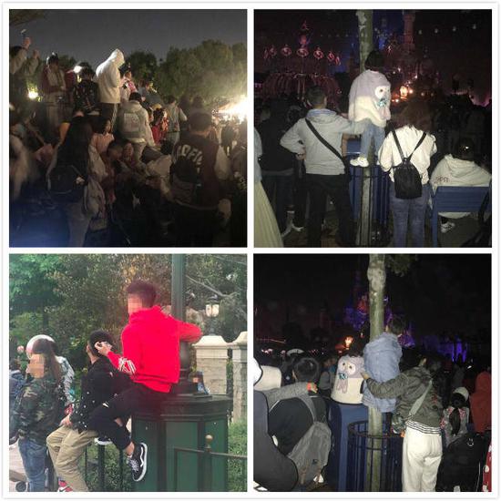 实话说,精彩的花车巡游和烟花秀我们也就算凑了个热闹。花车如何精致、卡通人物如何可爱、城堡灯光如何绚丽……我们看不清。像我们这样个子不算高的游客,只能看到一半的天空夜景,靠下的一半是各色的帽子、雨衣、饰物和后脑勺的黑影……随着演出渐入佳境,人们会从乖乖的站着,逐渐垫脚观看,然后再爬上栏杆、长椅、树木、灯柱、垃圾箱,几乎所有你能想到的可以攀爬的地方都能看到游客矫健的身影。
