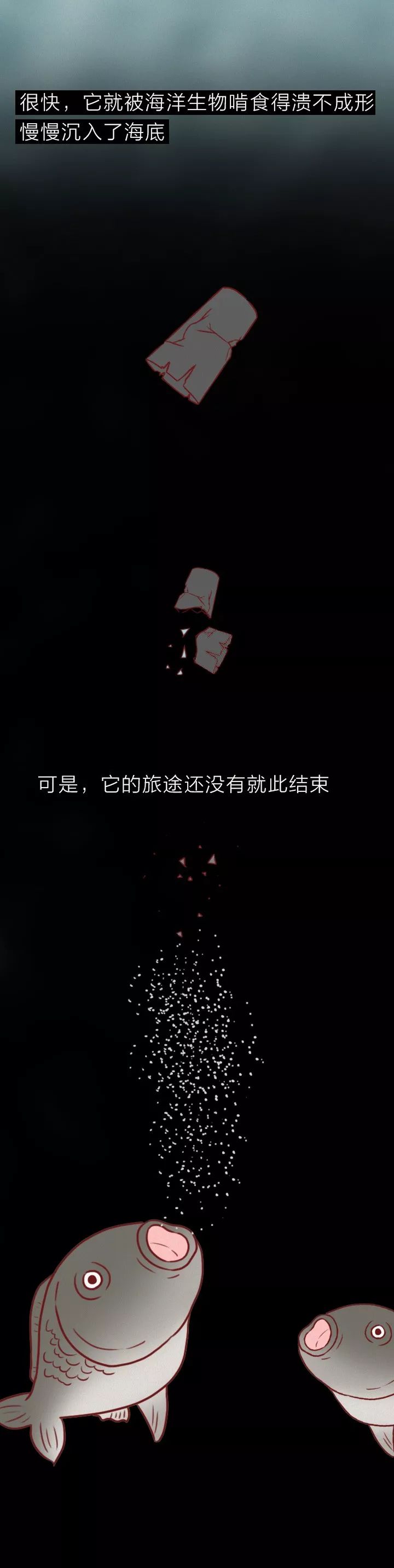 塑料的自然降解需要很长时间,扔进大海后会分解成细小的塑料颗粒,被鱼虾当做浮游生物吞噬,最终随着食物链回到人类的餐桌。