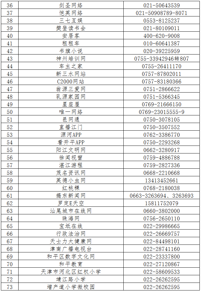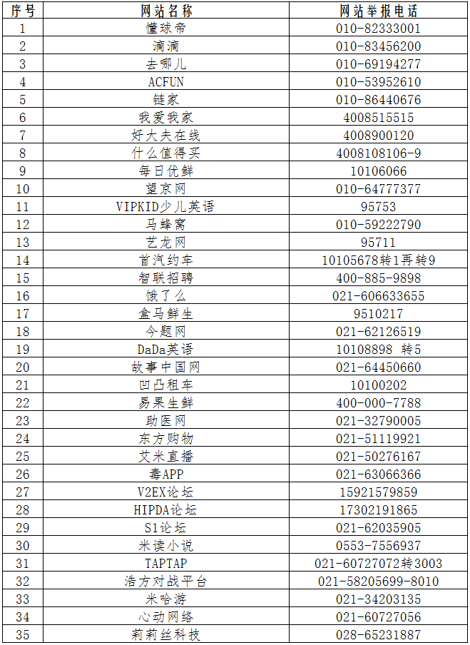 据了解,此次公布举报受理方式的网站,既包括地方政府政务网站、地方新闻门户网站、商业网站,又包括社区、论坛、微信公众号等互动平台,以及直播、游戏、APP应用程序等互联网应用平台,内容涉及生活服务、房屋租赁买卖、网约车、求职招聘、教育培训、旅游出行、小说文学、医疗服务等多个方面。其中,滴滴出行、首汽约车、去哪儿、途牛旅游等网民使用率较高的出行、旅游类应用平台,链家地产、我爱我家等房屋交易类应用平台,盒马鲜生、饿了么等生活服务类应用平台在公布名单之列。