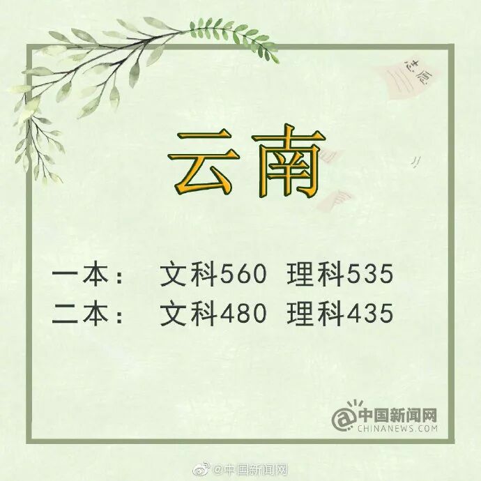 6月23日,2019年云南省普通高校招生考试录取最低控制分数线公布:一本文史类560分,一本理工类535分;二本文史类480分,二本理工类435分。