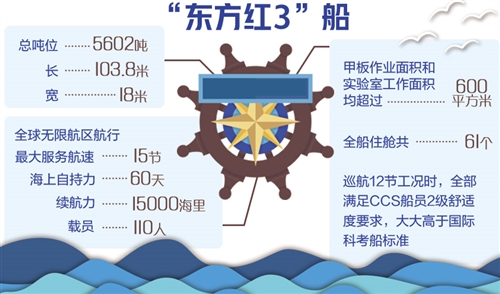 “东方红3”船是一艘5000吨级新型深远海综合科学考察船,以培养深海大洋创新型人才为首要任务,融合科学研究、科学考察、高新技术研发应用为一体。该船总长103.8米、宽18米,海上自持力长达60天,可连续航行1.5万海里;载员110人,甲板作业面积和实验室工作面积均超过600平方米。该船是目前世界上最安静,定员最多,经济性、振动噪声、电磁兼容等指标要求最高,作业甲板和实验室面积利用率最大、综合科考功能最完备的新一代海洋综合科考船。
