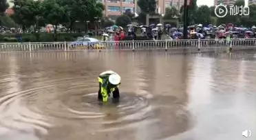 近日,暴雨突袭四川宜宾,59岁交警杨杰和同事们一直坚守岗位,疏导交通。