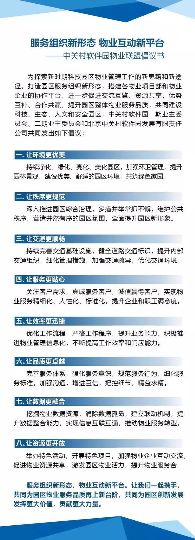 海淀区房管局房管六所蔡亦兵所长在会上讲话,对联盟工作提出了期望和要求。会议结束时,中关村软件园物业联盟成员单位共同签署倡议书。大家表示,物业联盟建设思路清晰、发展目标明确、运行机制先进,在共建单位的努力下,必将融入科技力量,实现技术升级服务升级,为中关村软件园广大企业的创新发展提供扎实有力的服务支撑。