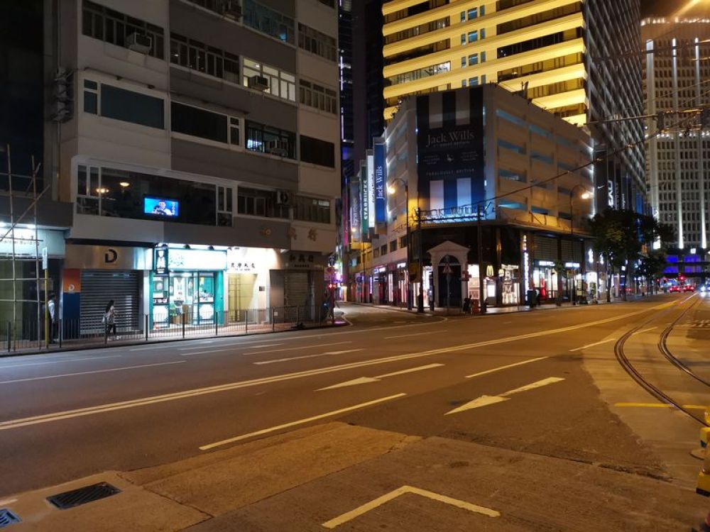 图为5日晚九点左右,靠近铜锣湾时代广场的街道空旷冷清。新华社记者刘欢摄
