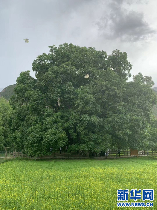 22日,在西藏林芝朗县冲康村,十几个青年人手挽着手合抱一棵核桃树,丈量这棵2000多年的古树树围。遮天蔽日的树冠,犹如一轮巨大伞盖,洒下一片清凉。树影斑驳间,累累核桃果点缀在古树上,真是一片绿叶成荫子满枝的景象。