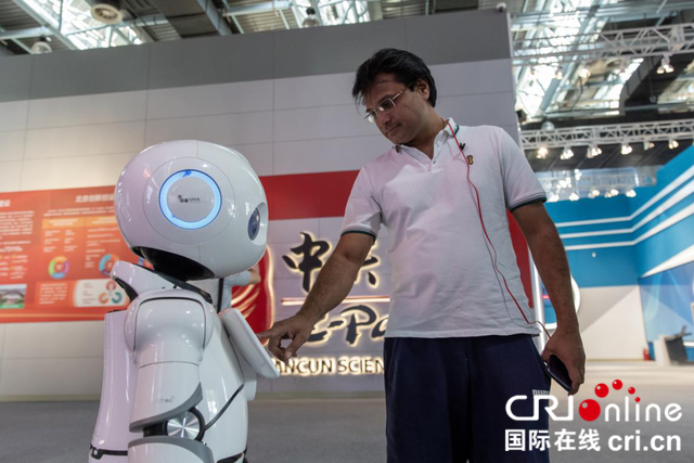 亚希尔在中关村国家自主创新示范展示中心与智能机器人进行互动 摄影 沈湜