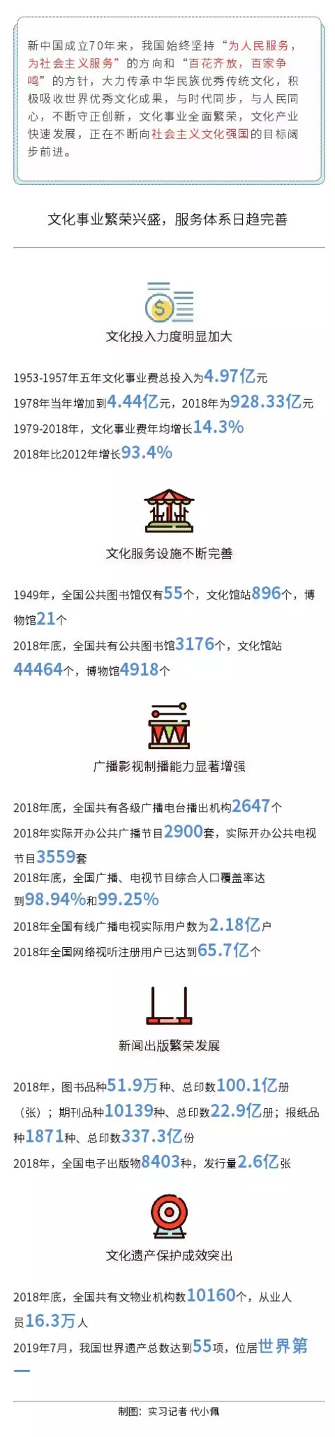 事实上,包括文化遗产保护在内,新中国成立70年来,我国文化事业日益繁荣,文化产业快速发展,所取得的各项成就有目共睹。国家统计局日前发布的相关报告对此作出了有力的注解。让我们透过一组组数字变化,来触摸和感受文化建设与发展的强劲脉动。