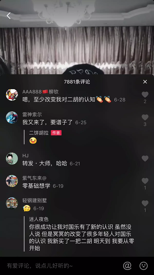 “你很成功地让我对民乐有了新的认识,虽然没人说,但是冥冥中改变了很多年轻人对民乐的认识,我新买了一把二胡,明天到,我要从零开始”。