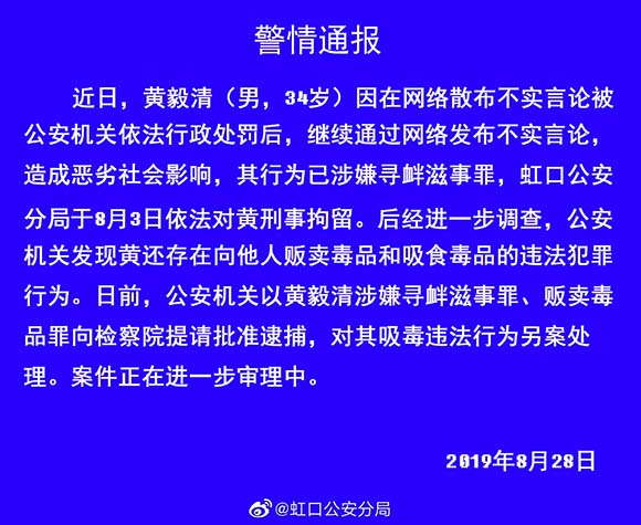 人民网北京8月28日电(记者孝金波、实习生杨佳佳)8月28日,上海市公安局虹口分局通报了黄毅清案处理进展:近日,黄毅清(男,34岁)在网络散布不实言论被公安机关依法行政处罚后,继续通过网络发布不实言论,造成恶劣社会影响。因其行为涉嫌寻衅滋事罪,8月3日,虹口公安分局依法对黄刑事拘留。公安机关进一步调查后发现,黄还存在向他人贩卖毒品和吸食毒品的违法犯罪行为。日前,公安机关以黄毅清涉嫌寻衅滋事罪、贩卖毒品罪向检察院提请批准逮捕,对其吸毒违法行为另案处理。案件正在进一步审理中。