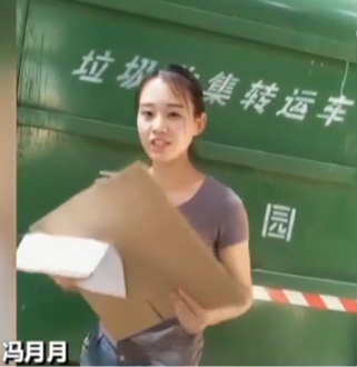 视频里的女孩叫冯月月,最近这段时间,她几乎每天都会在网络平台上录制一些短视频,拍摄背景大多是垃圾箱前,或者废品回收站里,内容则是劝导网友对垃圾进行正确分类,或者科普一些简单的鉴别方法。