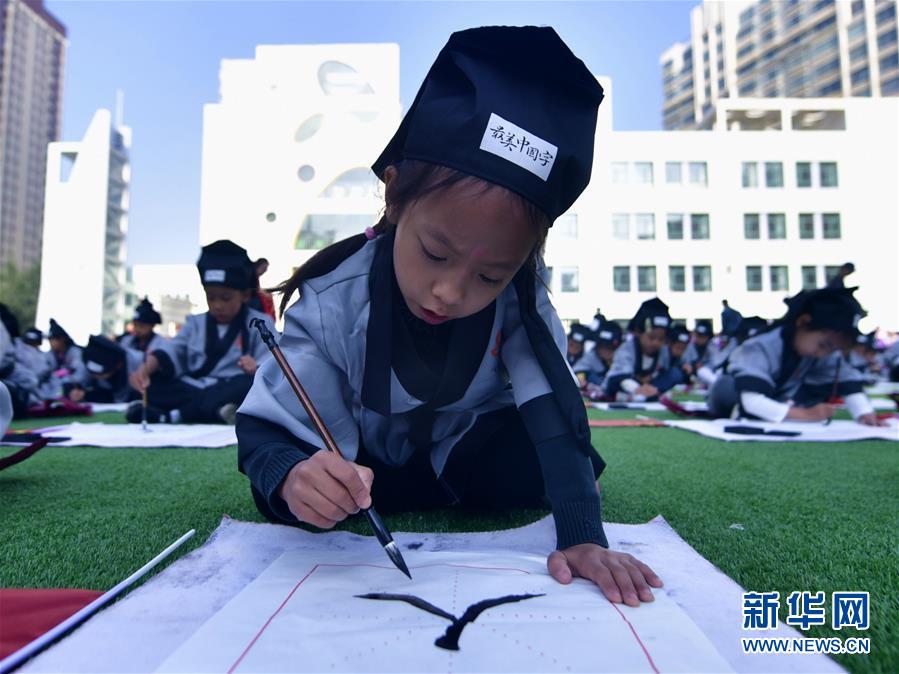 9月1日,青海省西宁市文汇小学一年级的学生在“开笔礼”仪式上书写“人”字。 新华社记者 张龙 摄