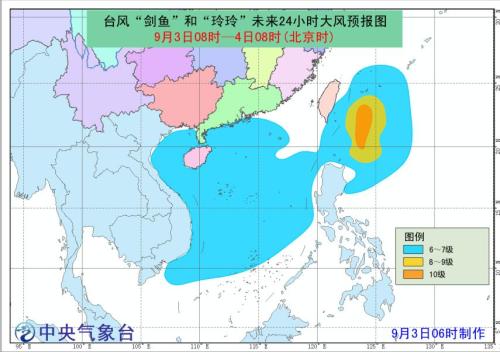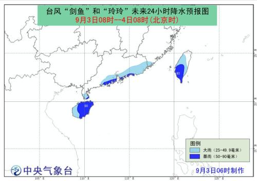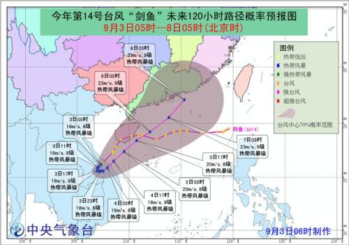中新网9月3日电 据中央气象台网站消息,中央气象台9月3日6时发布台风蓝色预警:昨天(2日)位于南海的热带低压已于今天凌晨2点钟在越南近岸加强为今年第14号台风“剑鱼”,预计,将于明天中午前后再次进入南海。今年第13号台风“玲玲”已于今天(3日)早晨由热带风暴级加强为强热带风暴级,逐渐靠近台湾以东洋面,强度逐渐增强,最大强度可达台风级。