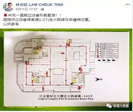 在暴徒冲击立法会前期,林卓廷专门在个人Facebook专页上详细介绍立法会综合大楼设置的消防路线图,为暴徒冲击破坏指明路线和重点目标。
