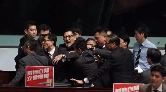7月1日,暴徒冲击立法会,消防、保安、通讯系统等大量设备遭到严重破坏。施暴过程中,很多暴徒手持立法会整体结构图,疑似事先有内部人员提供。