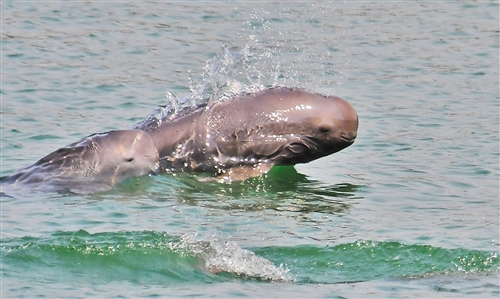 长江宜昌段,国家一级保护动物江豚与新出生的幼豚在江中畅游。 (摄于2018年4月)