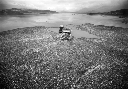 现代化的清漂专业船正在清理三峡库区水面上的漂浮物。 (摄于2010年6月)