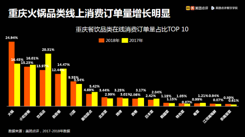 被外界称为“8D城市”的重庆,让人惊叹的不仅仅是其高低起落的交通布局,更是特色鲜明却又包罗万象的美食。《报告》显示,2018年重庆市商品零售额增长8.1%,餐饮收入额增长11.6%,整体处于较快增长水平。品类细分方面,火锅超越小吃快餐登顶重庆餐饮品类在线消费订单量占比排行榜,较上一年占比提升了8.49个百分点,增速第一。同时,火锅也凭借32.39%的消费金额占比,成为“最吸金”的餐饮品类,江湖地位难被撼动。与火锅高速增长相对比的是,饮品类在线消费订单占比下滑6.34个百分点,表现欠佳,位居第三。具体品牌方面,一只酸奶牛占据餐饮品牌在线订单量、餐饮品牌热搜两榜榜首。守柴炉烤鸭交易额第一。蓝点鳐泰餐厅则将口味、环境、服务三榜冠军收入囊中。