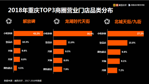 美团大数据显示,旅游“打卡”地——解放碑、龙湖时代天街、北城天街/九街、观音桥、洪崖洞等地点,同样也是餐饮市场的热门商圈。其中,声名远播的解放碑不负众望成为最热门商圈。从营业门店品类分布可以看到,解放碑是小吃快餐集中地,占比达43.2%,高于重庆整体占比水平。北城天街/九街则拥有15.0%的饮品店,远高于饮品店在重庆整体占比水平的4.94%。吃在解放碑,喝在北城天街,重庆人从来不缺美食的慰藉。