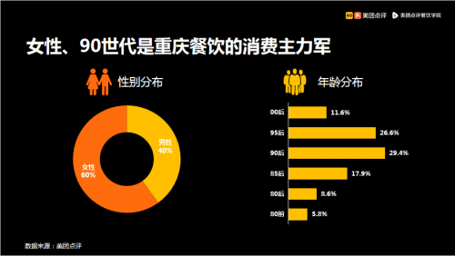 值得注意的是,在重庆的餐饮市场上,年轻群体逐渐成为消费的主流人群。《报告》显示,女性、90世代是重庆餐饮的消费主力军。从性别上看,女性以60%的占比大幅领先于男性,使得“她经济”成为餐饮商户共同关注的焦点。从年龄上看,90年代以后的消费者占比高达67.6%,以绝对优势掌控着线上餐饮的话语权。这一消费者群体结构,也将影响着重庆餐饮市场的变革与发展。美团大数据显示,从全国数据看,“辣”是年轻群体最钟爱的口味,无论是90后、95后还是00后,对“辣”的偏好占比都超过了50%,远高于其他口味。而这一特点在重庆则更加明显。