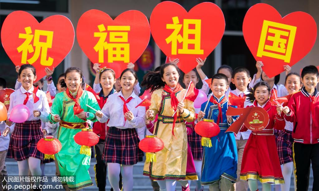 2019年9月30日,内蒙古呼和浩特市玉泉区恒昌店巷小学开展“我与祖国共成长”活动,组织学生与国旗合影、歌唱祖国、绘制赞美祖国的绘画长卷等形式多样的活动,表达对伟大祖国的热爱和祝福,庆祝中华人民共和国成立70周年。丁根厚/摄