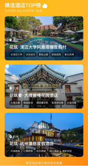 作为集团旗下酒店的官方预订平台,在花筑旅行APP上不仅可以便捷选择遍布知名景区的超过1000家花筑精选门店,还可以与热爱旅行的用户进行真实互动,轻松匹配到当地吃喝玩乐攻略,预订景区门票等相关旅行产品,一站搞定一次完美旅程。