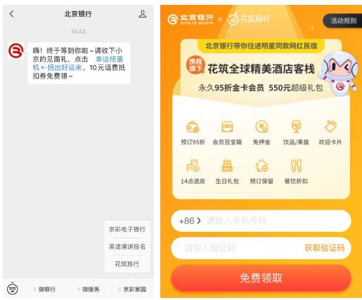本次福利放送将持续一个月,活动期间,用户只需关注北京银行官方微信,点击右下方“京彩家园-花筑旅行”,即可免费领取“花筑旅行”永久金卡会员身份以及550元酒店客栈超级礼包,解锁旅悦集团旗下全球网红酒店预定95折、延迟退房、免押金、免费饮品果盘等诸多会员专享权益。