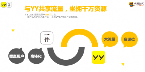 “YY一件”依托YY生态中庞大的娱乐粉丝的流量,通过直播购入口,将平台高粘性粉丝流量直接引入“一件”平台当中,实现娱乐流量快速衍生和高效的转化。让中小微商家通过低门槛和较少费用的付出,找到了快速布局全国的全新销售模式。