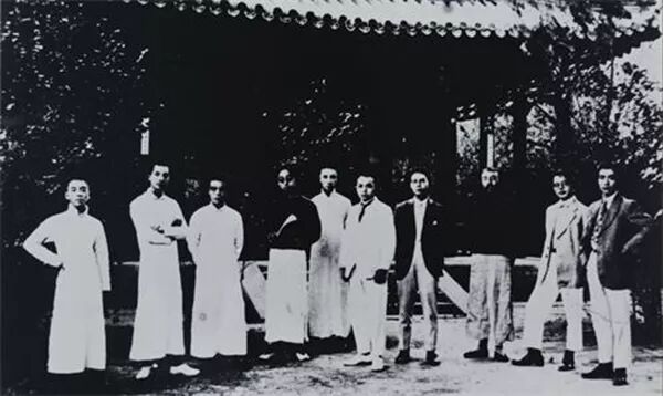 1918年6月,李大钊与王光祈等发起成立少年中国学会。毛泽东、恽代英、邓中夏、李达、蔡和森、赵世炎、张闻天等都参加过这一组织。此为部分会员合影,右三为李大钊