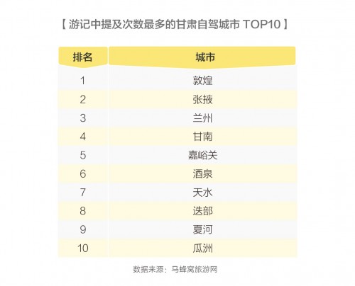 多样的地貌,大漠的风光,也让甘肃成为中国境内公路旅行最为热门的地区之一。数据显示,2018年自由行游客在游记中提及次数最多的甘肃自驾游城市是敦煌。敦煌是丝绸之路的节点城市,以“敦煌石窟”、“敦煌壁画”闻名天下,游客通过自驾敦煌得以深度体验丝路文明。同处丝绸之路经济带的张掖和兰州也为自驾游热门城市。