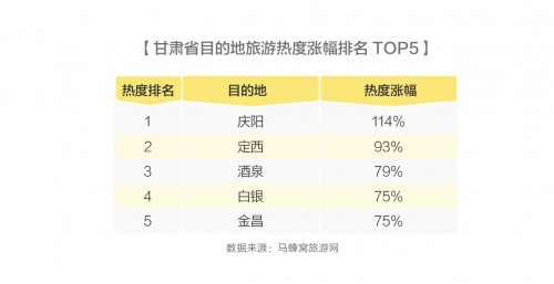 马蜂窝大数据显示,在甘肃省所有旅游目的地中,庆阳市的热度涨幅位居第一,涨幅高达114%。