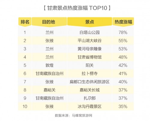 马蜂窝数据研究中心负责人马禹涛表示,甘肃省是中国丝路文化和长城文化的交汇点,具有极为深厚的历史文化底蕴。近年来,随着“一带一路”倡议的不断推进,甘肃的旅游热度迎来了新一轮增长,甘肃省也将“交响丝路·如意甘肃”作为其文旅形象,进一步增强大众对于甘肃的旅游认知度,积极扩大甘肃文化旅游资源的知名度与影响力。