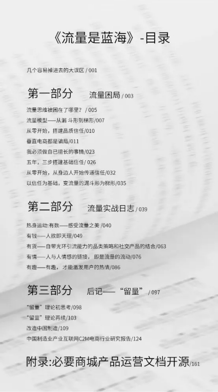 结合上必要商城内部产品运营文档、书中必要商城的实践案例、以及作者实践后总结的方法论,相信每一个认真的实践者都能找到属于自己的“流量蓝海”!
