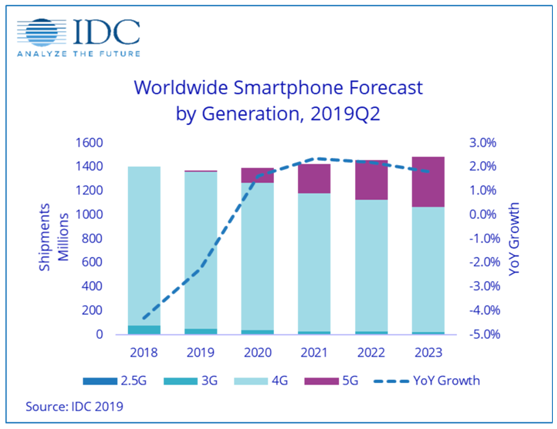 5G手机市场真正爆发要等到2020年。 根据IDC的数据,预计到2020年,5G智能手机出货量将达到1.235亿部, 占智能手机总出货量的8.9%。 预计到2023年,5G智能手机出货量将占智能手机总出货量的的28.1% 。