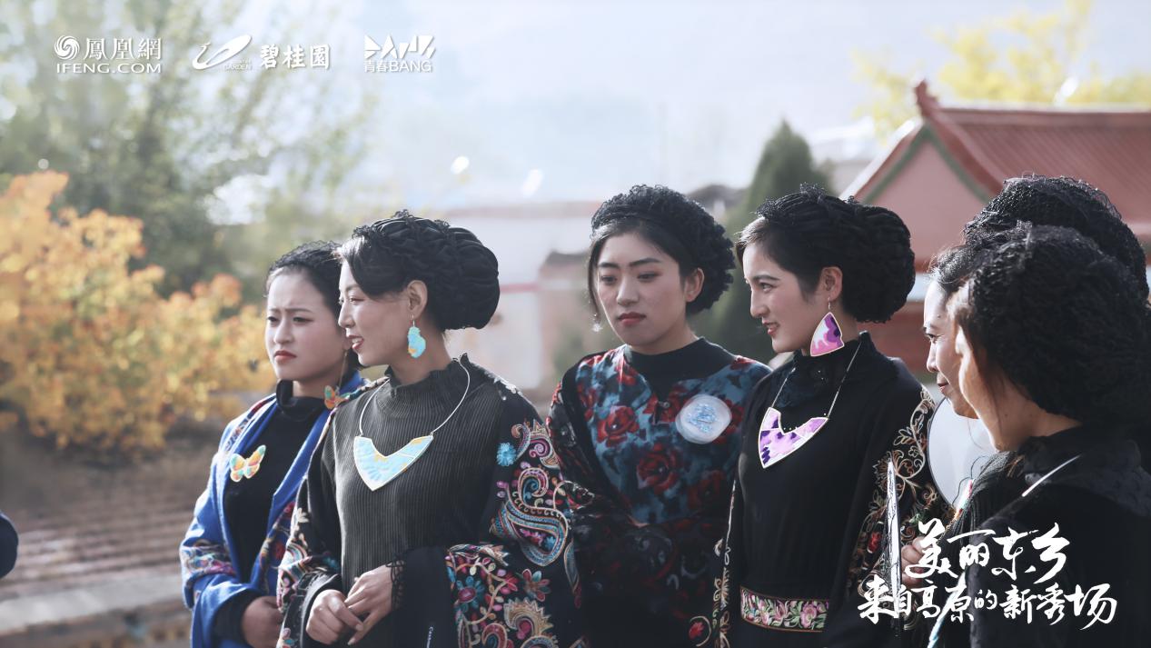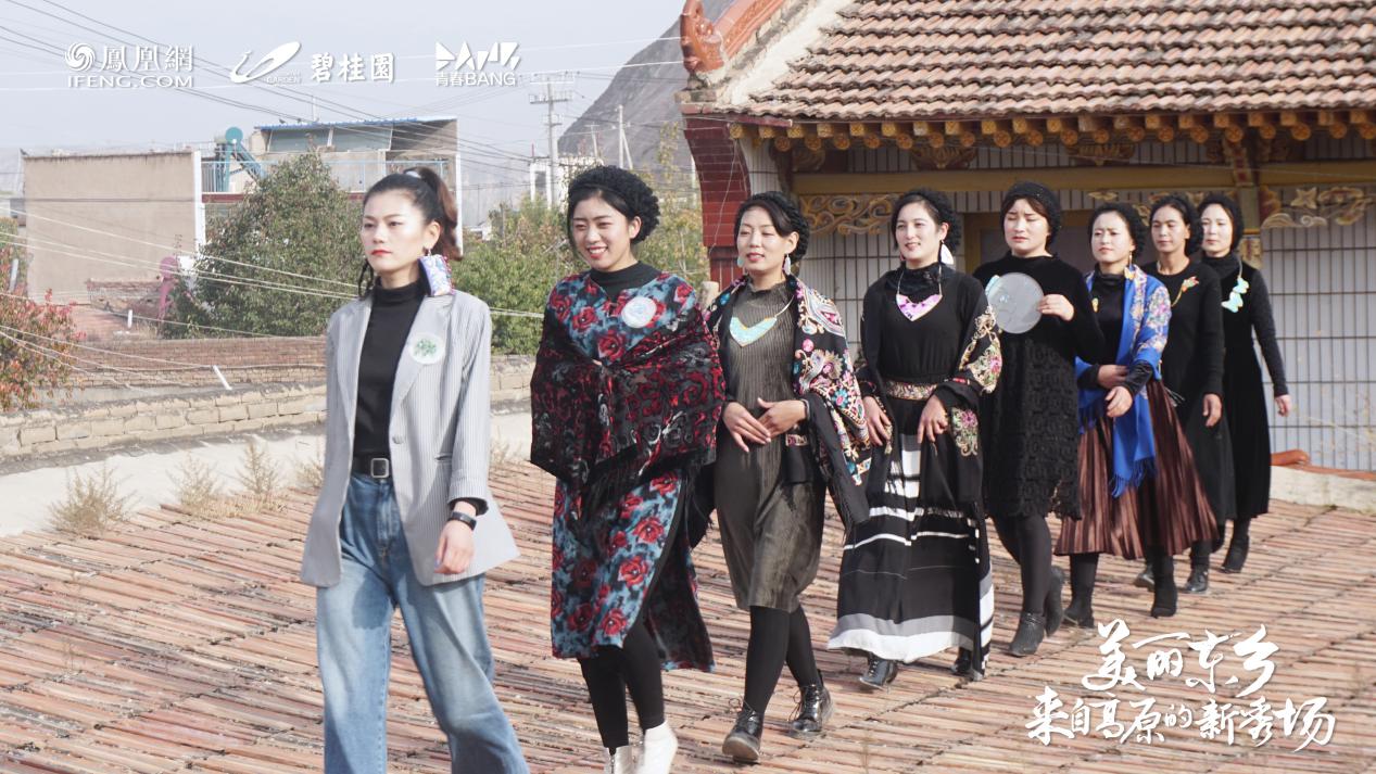 精致的妆容,搭配着传统与时尚结合的饰品,绣娘们开始了生平第一场户外走秀。背后是墨绿的群山与赤红色的泥土,脚下是略微不平的墙石瓦砾,这是属于绣娘们的高光时刻,站在屋顶上的她们是唯一主角,是独立且充满生机的存在。